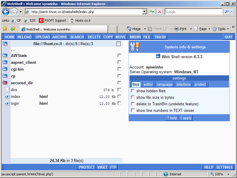 1. כניסה לממשק הניהול באמצעות שם המשתמש והסיסמה https://cp.1host.co.il:8443