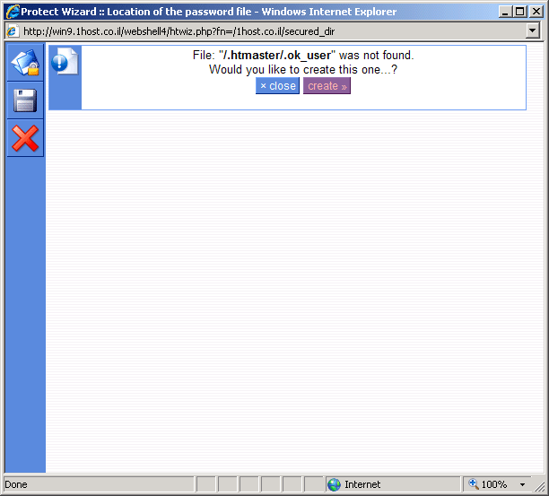 7. במידה וזו פעם ראשונה שבה אתם יוצרים את קובץ ההרשאות, יופיע בפניכם החלון הבא הדורש מכם ללחוץ על create על מנת ליצור את הקובץ, במידה וכבר יצרתם את קובץ ההרשאות בעבר אנא המשיכו לשלב 8.