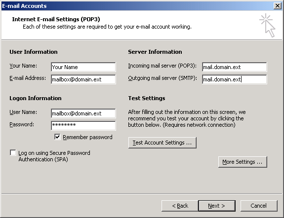Incoming mail server (pop3): כתובת שרת הדוא"ל הנכנס (mail.yourdomain.ext)