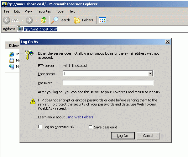 4. כנס לדפדפן בשורת הכתובת הקש //:ftp ואת הכתובת שהופיעה ב Host Name לדוגמא: ftp://win1.1host.co.il