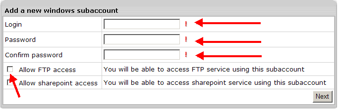 בחלון שנפתח הקישו שם משתמש, פעמיים סיסמה , סמנו V ליד המילים Allow FTP accessולחצו next.