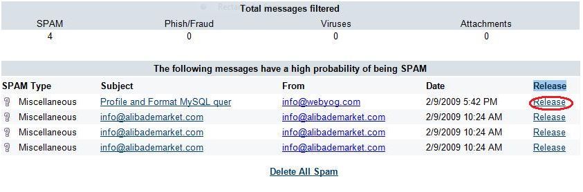 כברירת מחדל פעם ביום נשלח דו"ח חסימה לכל אחת מהתיבות . הדוח"ח מכיל רשימת המיילים החסומים וקישור לשיחרורם. כדי לשחרר מייל מרשימת מיילים החסומים יש ללחוץ על release
