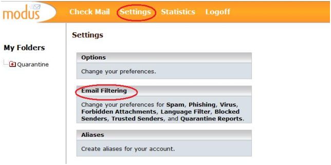 כדי לבצע התאמות אישיות או לשלוח דו"ח חסימה , יש להכנס ל Settings דרך תפריט הראשי ולאחר מכן ל email filtering