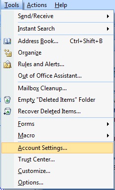 על מנת להגדיר את תיבת הדואר שלכם ב outllok 2007 יש ללחוץ בתפריט העליון על Tools ולאחר מכן לבחור ב Account settings.