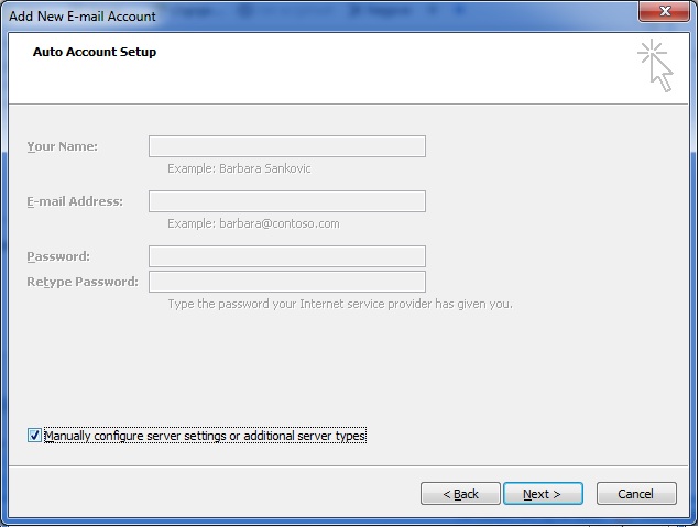 בחלון הבא, סמנו את תיבת הסימון התחתונה "Manually configure server settings"