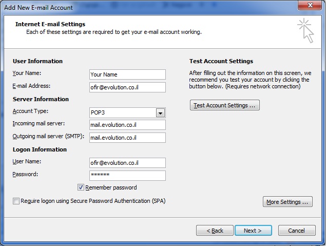 Username - יש לרשום את תיבת הדואר שלכם (את כל התיבה, לדוגמא אם תיבת הדואר שלכם היא name@evolution.co.il יש לרשום name@evolution.co.il)